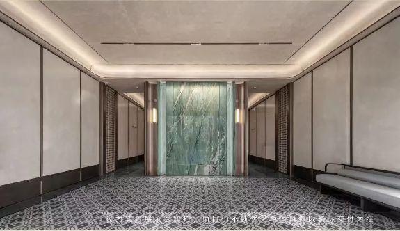 入户精装大堂,提取宋代汝窑中的一抹“天青”,臻选翡翠绿奢石定制背景墙,辅以白玉岩板,搭配金色勾边的宋韵构件,匠造出雅致奢华空间。