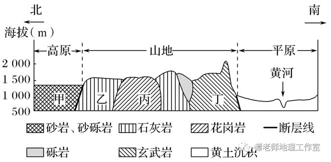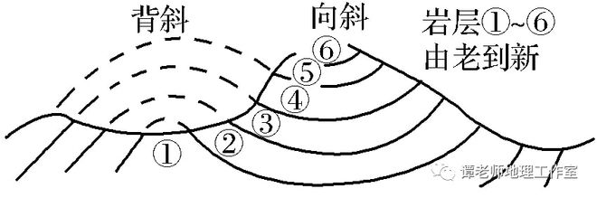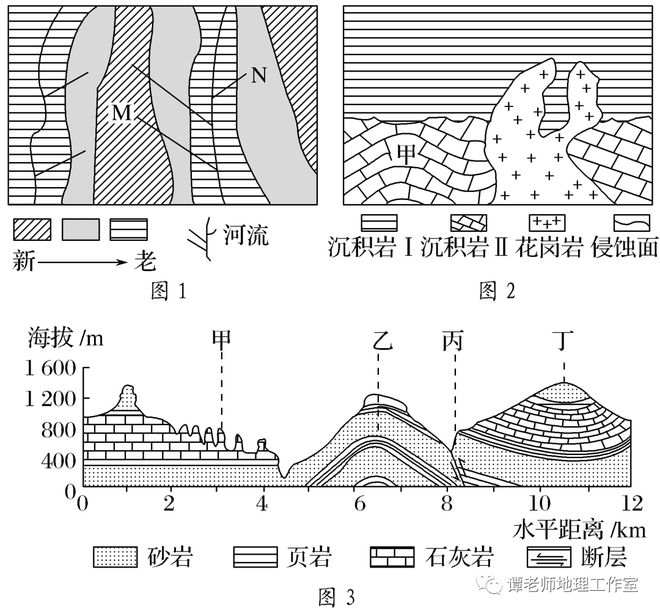 通过图例可以了解图示地区存在的岩层类型及其新老关系,也可以通过岩层之间的关系判断岩层的新老关系。一般沉积岩呈层状分布,老岩层在下,新岩层在上;若为背斜(如图3乙处)则两翼新中间老;若为向斜(如图3丁处)则两翼老中间新;若有侵入岩体(如图2),侵入岩体要比被侵入的岩层新。
