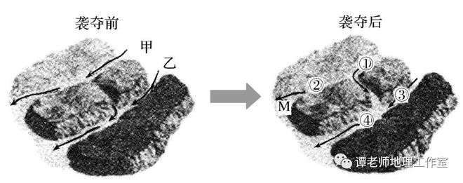 2.(2019·东北三省三校二模)相邻的两条河流,在发育的过程中,低位河若具有较强的侵蚀力,河谷上源不断加长,致与高位河相遇,进而袭夺其河水的现象称为河流袭夺。下图为河流袭夺前后的示意图,据此完成(1)~(3)题。