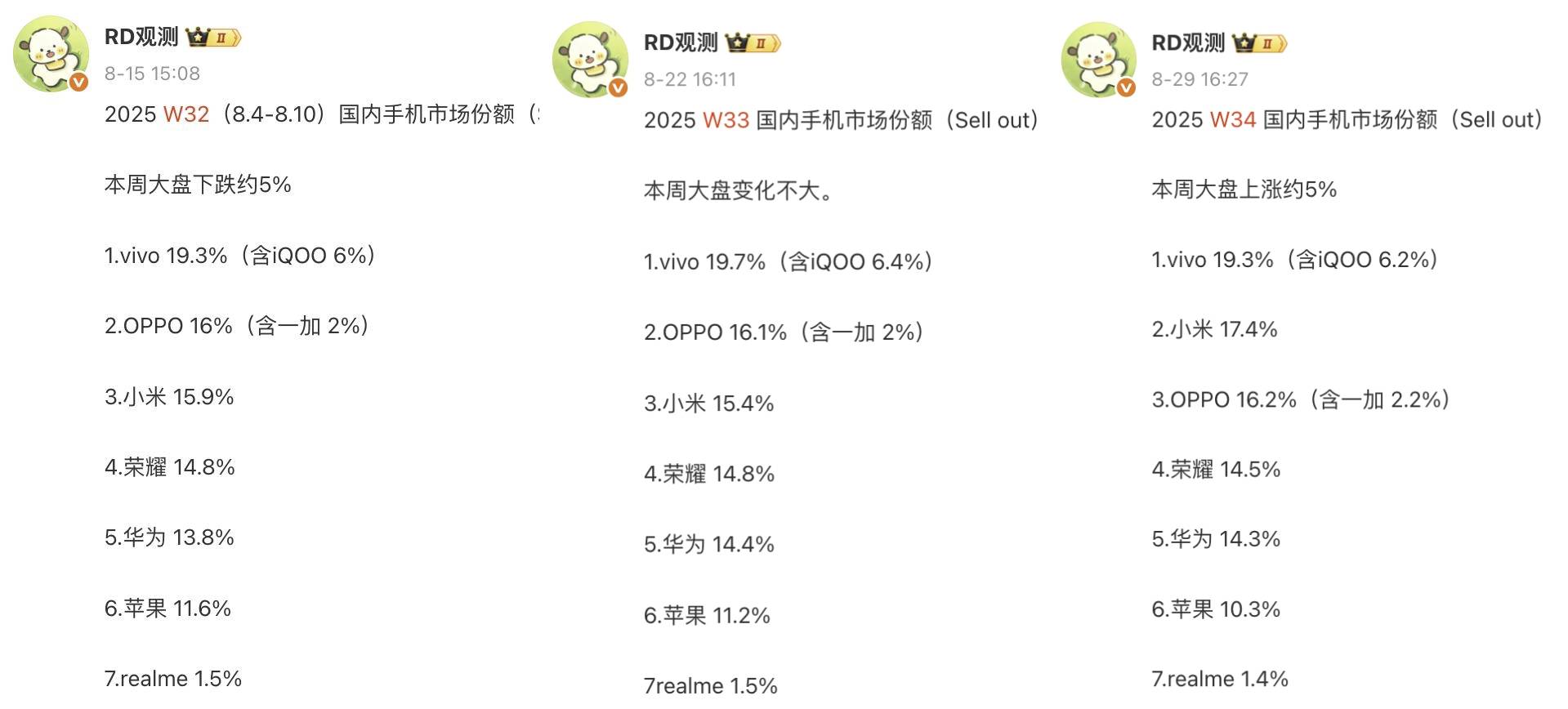 排名第四的是OPPO,它的市场份额为15.7%,其中一加的市场份额是2.4%。在2025年H1榜单中,OPPO以14.7%的市场份额排名第五,在7月份榜单中以16.1%的市场份额排名第三,所以第三季度的OPPO手机销量在大幅提升。在8月份的周榜中,OPPO多次打败小米排名第二,W35被小米反超的原因是红米Note15系列开售。