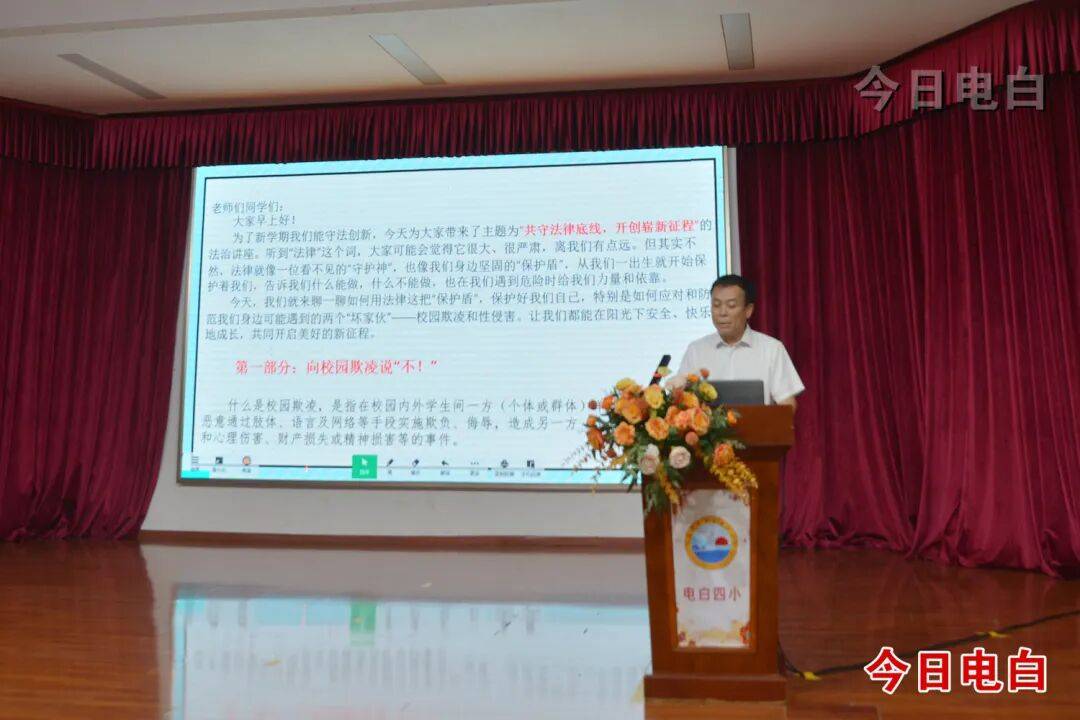 ”专场普法宣传活动在电白区第四小学举行。本次活动由电白区普法办公室、电白区司法局联合主办,电白区教育局、共青团电白区委员会、电白区电海街道禁毒办公室协办,电白区第四小学承办。电白区第四小学全体教职工、部分学生及家长代表,各主办、协办单位分管领导、普法业务骨干,以及普法志愿者