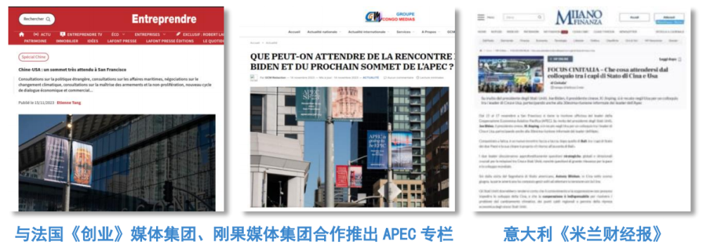 合作传播。总台与法国、俄罗斯、意大利、委内瑞拉、哈萨克斯坦、阿尔及利亚、叙利亚、伊拉克、摩洛哥等国31家媒体合作发布中美元首会晤相关报道78次。总台与法国《创业》媒体集团、刚果媒体集团、布基纳法索庭伽新闻推出APEC专栏,联合策划发布《中美元首会晤值得期待》等文章。意大利《米兰财经报》刊发总台意大利语特稿《中美元首会晤,为中美关系领航,促全球发展受益》。