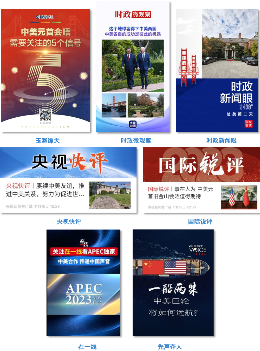 精准解读。总台系列评论言论特稿多角度阐释中美元首会晤重要意义,对外释放“稳定”的积极信号。“央视快评”“国际锐评”“玉渊谭天”“时政新闻眼”“时政微观察”“主播说联播”“联播+”“天天学习”等推出《中美元首会晤需要关注的5个信号》《中美应有怎样的新愿景?习主席强调五根支柱》《“中美要好好打交道”,这一天旧金山两场对话举世瞩目》《从旧金山再出发》《中美关系这道“必答题” 习主席给出解题要点》等多样态评论产品,抽丝剥茧、细致入微,多维度解析面向未来的“旧金山愿景”。英语评论品牌“在一线”“先声夺人”、俄语评论栏目“议热点”、多语种评论品牌“天下观”“热点观察”等推出《中美关系的不断改善对于稳定地缘政治形势是必要和有益的》《中美元首会晤对全球产生积极影响》《一船两桨 中美巨轮将如何远航?》等评论产品,借“外嘴”阐述中美关系的重要性,凸显中美元首外交的历史传承和时代价值,被海外主流媒体转载刊发1350篇次。