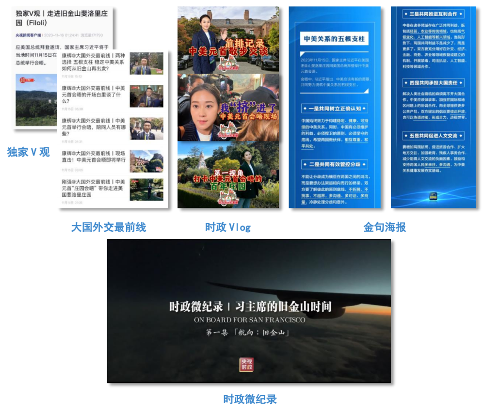 “零距离”观察,感受大国外交核心现场!“大国外交最前线”“时政Vlog”“独家V观”等栏目密集发布《中美元首会晤的开场白里谈了什么?》《两种选择 五根支柱 稳定中美关系如何从旧金山再出发》《前排记录中美元首散步交谈》等20期产品,“时政微纪录”推出系列微纪录片《习主席的旧金山时间》,金句海报《习:中美各自的成功是彼此的机遇》等,“零距离”观察,贴近式解读,带领网友“沉浸式”感受中美元首会晤现场。